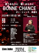 | 歌うあなたに 聴くあなたに BONNE CHANCE ボン・シャンス 幸運を 出演:伊藤久子/桑原佳代子/津島のり子/西村恵美/倍川真由美 MIZUHO/みなみ/Katsuco/梶本りえ/Kai 演奏:中野力(Bass)新田佳則(Pf) Guest:Wen Shu(Vo)Open 14:00 Start 14:30 3000円(ドリンク別) 連絡先:090-7136-8906(Kai) | ||