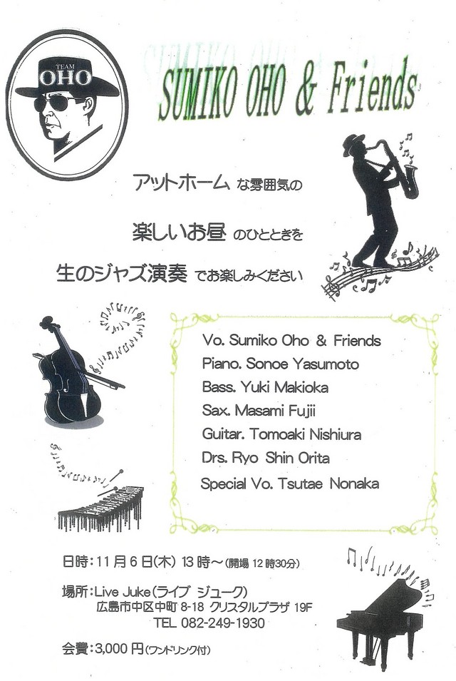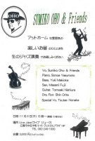 | SUMIKO OHO & Friends Sumiko Oho & Friends(Vo)保本園枝(Pf)牧岡勇気(Bass)折田新(Dr) 西浦トモアキ(Gt)藤井政美(Sax) Special Vo:野中つたえOpen 12:30 Start 13:00 3000円(1ドリンク付) | ||