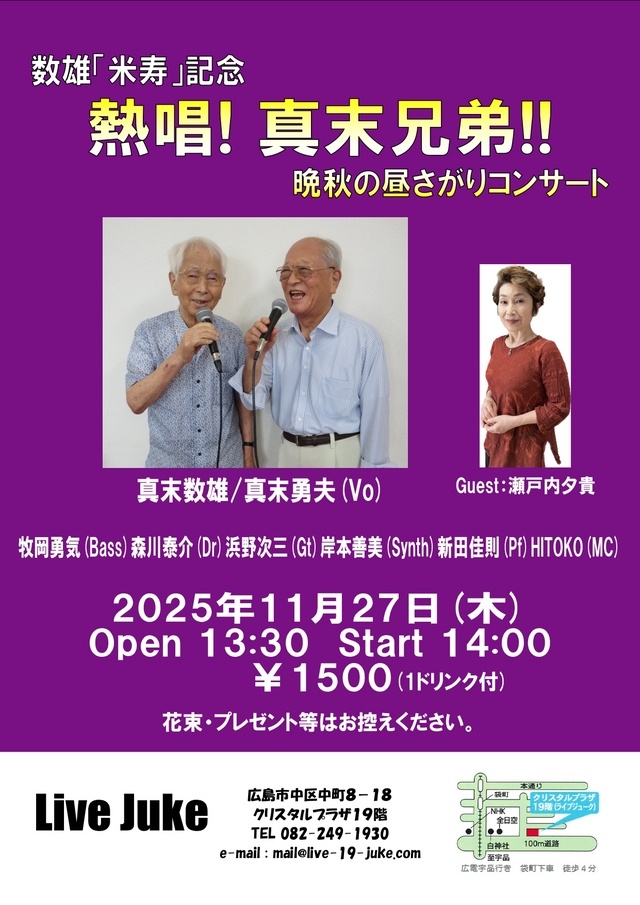 | 熱唱! 真末兄弟!! 晩秋の昼さがりコンサート 真末数雄/真末勇夫(Vo)牧岡勇気(Bass)森川泰介(Dr)浜野次三(Gt) 岸本善美(Synth)新田佳則(Pf)HITOKO(MC) Guest:瀬戸内夕貴Open 13:30 Start 14:00 1500円(1ドリンク付) 花束・プレゼント等はお控えください。 | ||