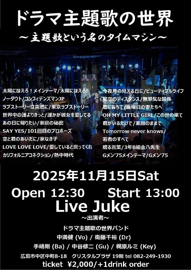 | ドラマ主題歌の世界 中満健(Vo)梶原ルミ(Key) 中谷修二(Gt)手嶋剛((Bass)衛藤千裕(Dr)Open 12:30 Start 13:00 2000円(ドリンク別) | ||