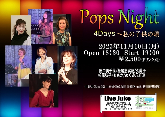 | ポップスナイト 4Days ~ 私の子供の頃 田中美千代/ももか/松尾弘子 松尾恵実花/めぐみ/SATOMI/久美子 中野力(Bass)森川泰介(Dr)倉田香織(Synth)新田佳則(Pf)Open 18:30 Start 19:00 2500円(ドリンク別) | ||