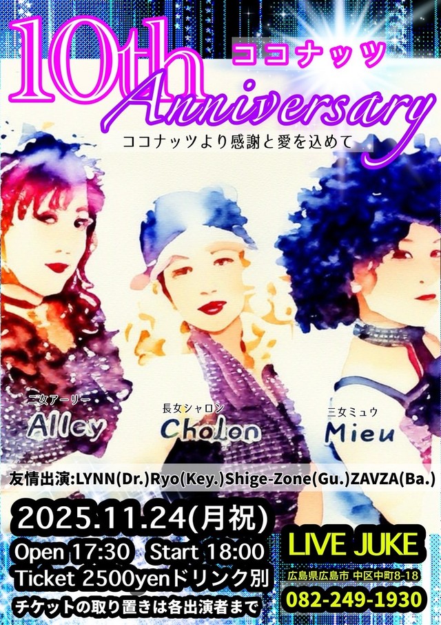 | ココナッツ 1Oth Anniversary Ryo(Key)Shige-Zone(Gt)ZAVZA(Bass)LYNN(Dr) シャロン/アーリー/ミュウ(Vo)Open 17:30 Start 18:00 2500円(ドリンク別) チケットの取り置きは各出演者まで | ||
