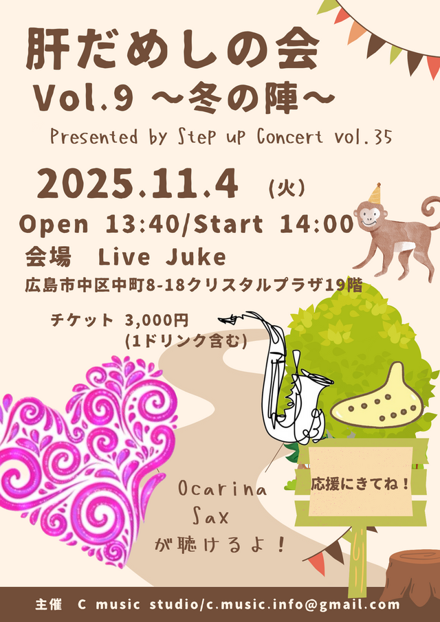 | 肝だめしの会Vol.9~冬の陣~ presented by Step up Concert vol.35 青木佐和子/沖田信子/川恵京子/川島幸子/木村和枝 後藤富子/菅桂子/たまごクラブ・長峰幸子/橋本文恵 田村恭子/中川令子/浜咲敦/宮地ひろ子/山下美知子Open 13:40 Start 14:00 3000円(1ドリンク付) ご予約・お問合せ:c.music.info@gmail.com | ||