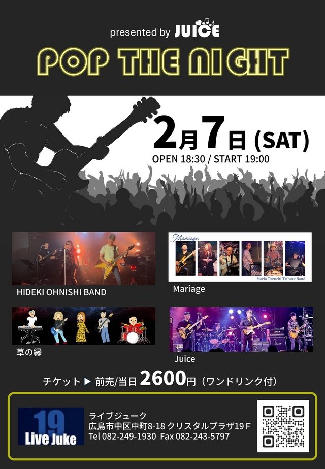 | POP THE NIGHT HIDEKI OHNISHI BAND/Mariage/草の縁/JuiceOpen 18:30 Start 19:00 2600円(1ドリンク付) | ||