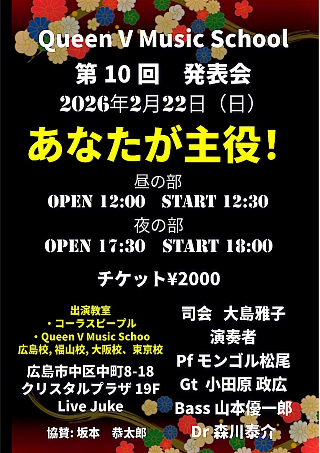 | Queen V Music School 第10回発表会 森川泰介(Dr)山本優一郎(Bass)小田原政広(Gt)モンゴル松尾(Pf&Key) 2000円(ドリンク別) ①Open 12:00 Start 12:30 ②Open 17:30 Start 18:00 | ||