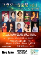 | フラワー音楽祭 vol.1 ~ シャンソン花の祭典 小林一美/福本由季子/水麗/寺岡慶子/SHIZUKA 山田なな/丹土敏子/桑原佳代子/久保静代/津島のり子 牧岡勇気(Bass)石井聡至(Dr)岸本善美(Synth)新田佳則(Pf) ビデオ収録:藤浪隆志Open 13:00 Start 13:30 入場無料(ドリンク別) | ||