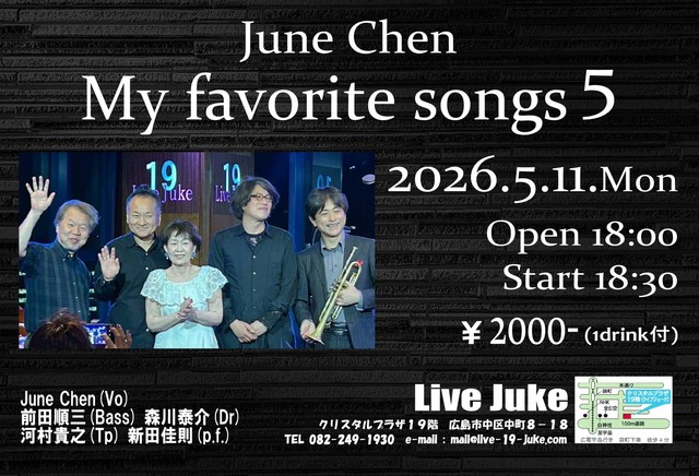 | June Chen My Favorite Songs 5 June Chen(Vo)前田順三(Bass) 森川泰介(Dr)河村貴之(Tp)新田佳則(p.f.)Open 18:00 Start 18:30 2000円(1ドリンク付) | ||