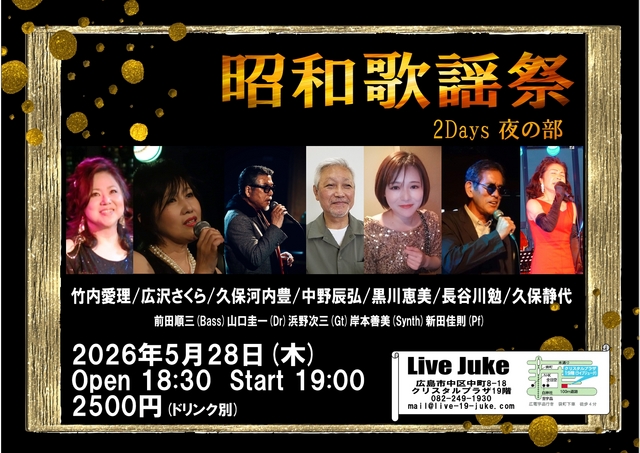 | 昭和歌謡祭 2Days 夜の部 広沢さくら/竹内愛理/久保河内豊 中野辰弘/黒川恵美/長谷川勉/久保静代 前田順三(Bass)山口圭一(Dr)浜野次三(Gt)岸本善美(Synth)新田佳則(Pf)Open 18:30 Start 19:00 2500円(ドリンク別) | ||