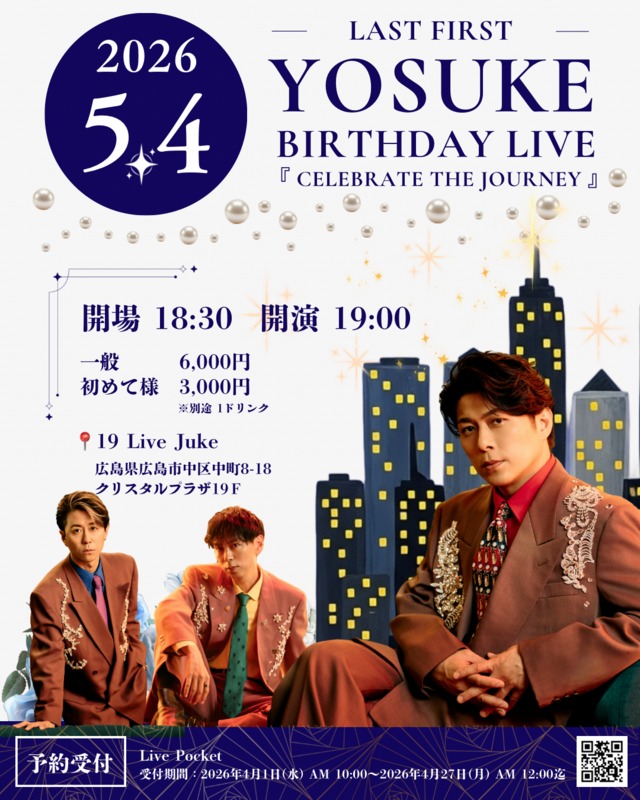 | LAST FIRST YOSUKE BIRTHDAY LIVE 『CELEBRATE THE JOURNEY』 Open 18:30 Start 19:00 前売6000円 初めて割3000円(ドリンク別) お申し込み期間:2026年4月1日(水) AM 10:00~2026年4月27日(月) AM 12:00迄 | ||