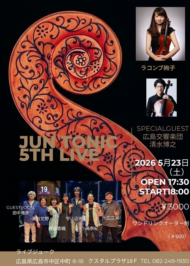 | JUN TONIC 5TH LIVE ラコンブ絢子(Vl)小嶋泰紀(Bass)升広立実(Gt)湊谷文野(Perc) 宇山正樹(Dr)倉田香織(Key)田中雅彦(Guest Vocal) SPECIAL GUEST:清水博之(Vc)Open 17:30 Start 18:00 | ||