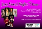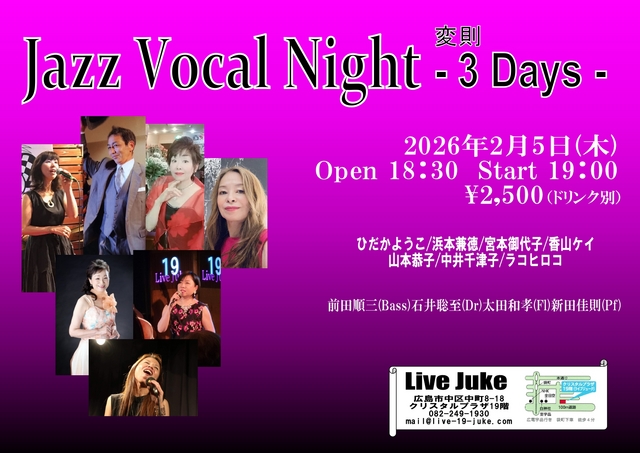 | Jazz Vocal Night 変則3Days 中井千津子/山本恭子/ラコヒロコ/香山ケイ ひだかようこ/宮本御代子/浜本兼徳 前田順三(Bass)石井聡至(Dr)太田和孝(Fl)新田佳則(Pf)Open 18:30 Start 19:00 2500円(ドリンク別) | ||