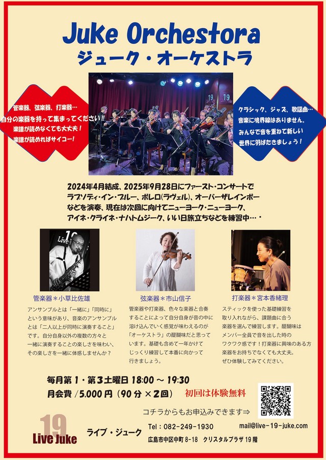 【ジューク・オーケストラ】管楽器、弦楽器、打楽器、3つの楽器群に分かれてアンサンブルを楽しみ、 全体練習でオーケストラを味わいます。 自分の楽器を持って体験してみてください。初心者も大歓迎です。 詳細は↓まで、お気軽にお問い合わせください♪ http://www.live-19-juke.com/orchestra/ |