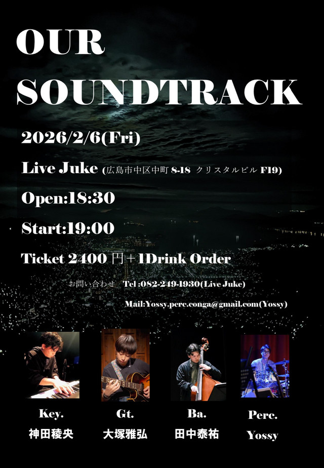 | OUR SOUNDTRACK 神田稜央(Key)大塚雅弘(Gt)田中泰祐(Bass)Yossy(Perc)Open 18:30 Start 19:00 2400円(ドリンク別) | ||