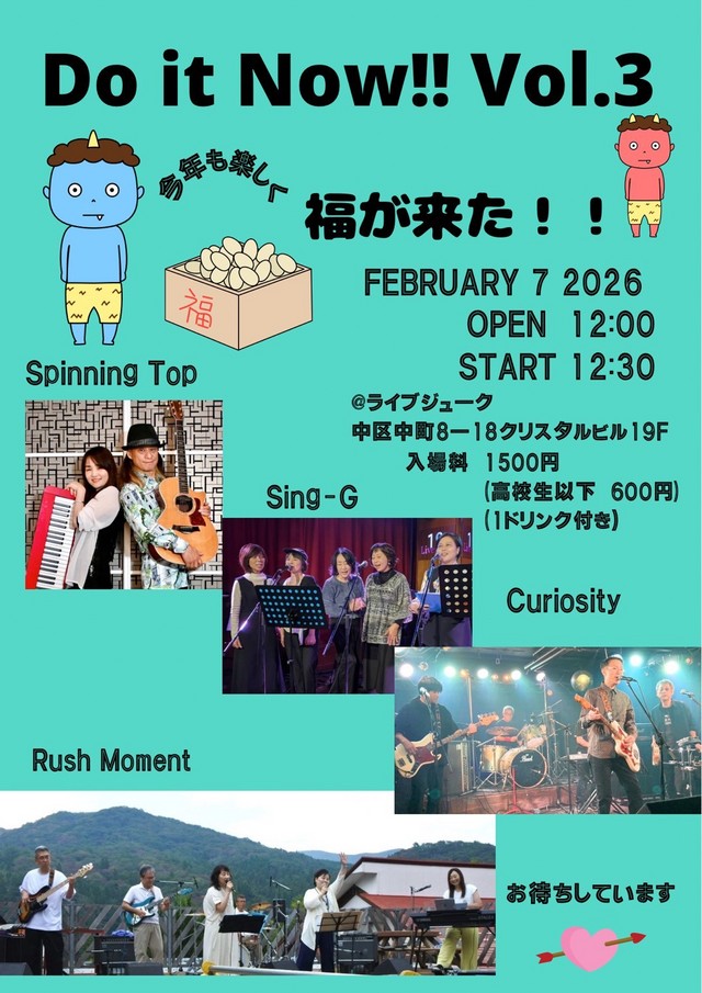 | Do it Now !! Vol.3 Spinning Top/Sing-G/Curiosity/Rush MomentOpen 12:00 Start 12:30 一般1500円 高校生以下600円(1ドリンク付) | ||