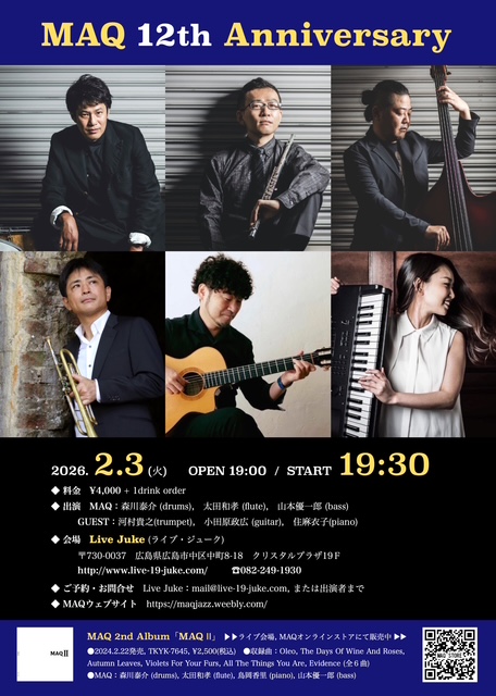 | MAQ 12th Anniversary MAQ:森川泰介(Dr)太田和孝(Fl)山本優一郎(Bass) GUEST:河村貴之(Tp)小田原政広(Gt)住麻衣子(Pf)Open 19:00 Start 19:30 4000円(ドリンク別) | ||
