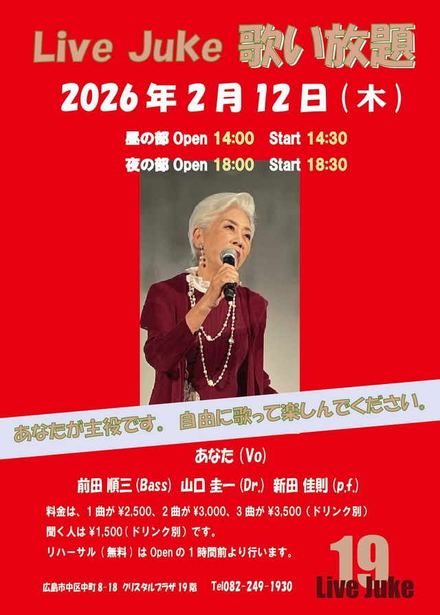 | 歌い放題 あなた(Vo)前田順三(Bass)山口圭一(Dr)新田佳則(Pf) 歌う人:1曲¥2500、2曲¥3000、3曲¥3500 聞く人:¥1500(それぞれドリンク別) ①Open 14:00 Start 14:30 ②Open 18:00 Start 18:30 ※リハーサルは開場時間の1時間前より行います | ||