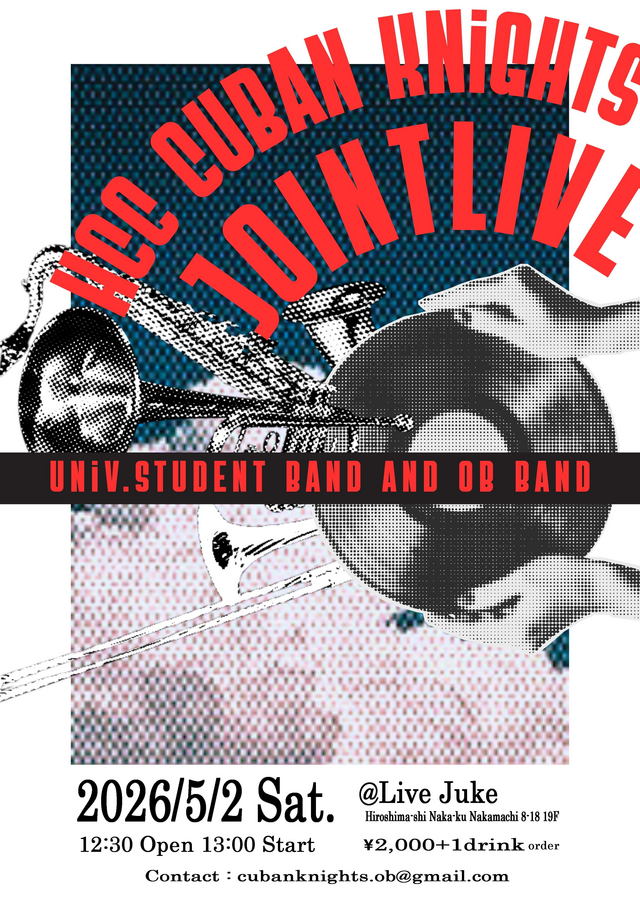 | HCC Cuban Knights JOINT LIVE Open 12:30 Start 13:00 お問合せ先:広島修道大学軽音楽部OB会事務局 担当/長尾 | ||