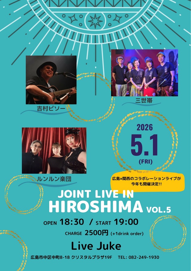 | JOINT LIVE IN HIROSHIMA 三世帯/吉村ビソ―/ルンルン楽団Open 18:30 Start 19:00 2500円(ドリンク別) | ||