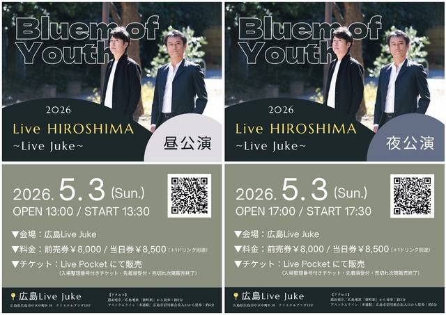 | Bluem of Youth Live2026 【昼公演】Open13:00/Start13:30 【夜公演】Open17:00/Start17:30 前売8000円 当日8500円(ドリンク別) チケットサイト | ||