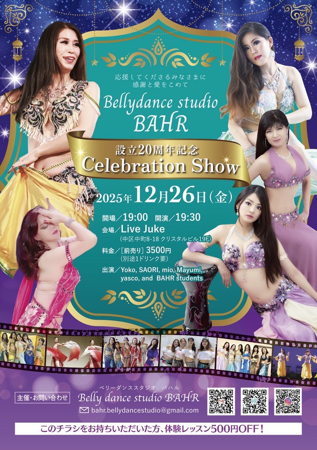 | Bellydancestudio BAHR 設立20周年記念 Cereblation show Open 19:00 Start 19:30 前売3500円(ドリンク別) 主催:お問合せ/Bellydancestudio BAHR:bahr.bellydancestudio@gmail.com | ||
