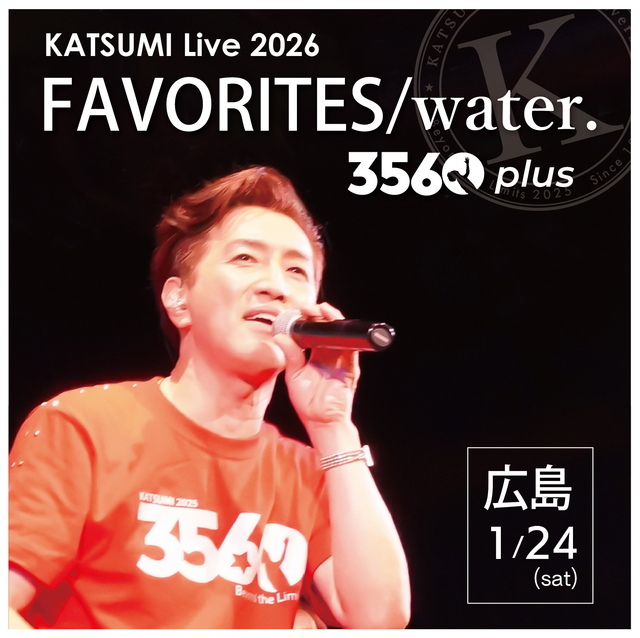 | KATSUMI Live 2026 「FAVORITES/water.3560 plus」in 広島 KATSUMI(Vo,Gt,Pf) 企画・制作:TriumphOpen 17:30 Start 18:00 前売6000円(ドリンク別) 11月1日(土)12:00よりメール予約受付開始! | ||