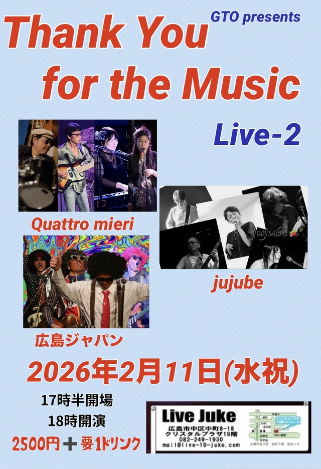 | Thank You for the Music Live-2 Quattro mieri/jujube/広島ジャパンOpen 17:30 Start 18:00 2500円(ドリンク別) | ||