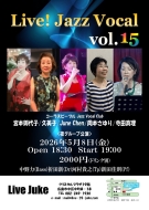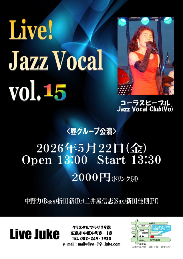 | Live! Jazz Vocal vol.15 コーラスピープルJazz Vocalクラブ 昼グループ(Vo) 中野力(Bass)折田新(Dr)二井屋信志(Sax)新田佳則(Pf)Open 13:00 Start 13:30 2000円(ドリンク別) | ||