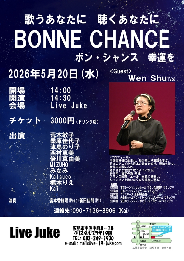 | フラワー音楽祭 vol.1 ~ シャンソン花の祭典 小林一美/福本由季子/水麗/寺岡慶子/SHIZUKA 山田なな/丹土敏子/桑原佳代子/久保静代/津島のり子 牧岡勇気(Bass)石井聡至(Dr)岸本善美(Synth)新田佳則(Pf) ビデオ収録:藤浪隆志Open 13:00 Start 13:30 入場無料(ドリンク別) | ||