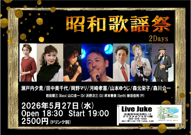 | 昭和歌謡祭 2Days 田中美千代/河崎孝憲/瀬戸内夕貴 山本ゆうじ/岡野マリ/森元栄子/森川公一 前田順三(Bass)山口圭一(Dr)浜野次三(Gt)岸本善美(Synth)新田佳則(Pf)Open 18:30 Start 19:00 2500円(ドリンク別) | ||