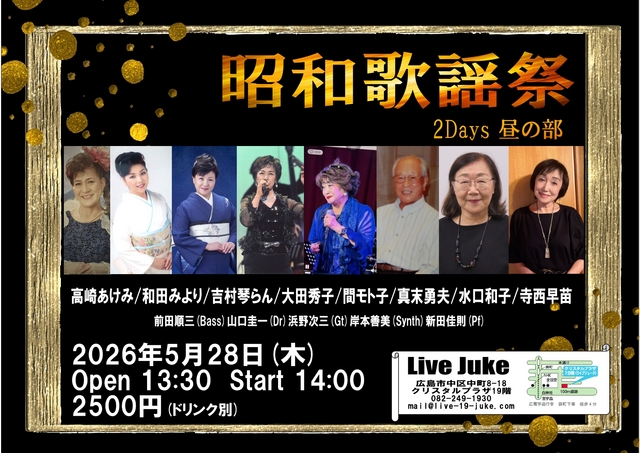 | 昭和歌謡祭 2Days 昼の部 高崎あけみ/和田みより/吉村琴らん/大田秀子 間モト子/真末勇夫/水口和子/寺西早苗 前田順三(Bass)山口圭一(Dr)浜野次三(Gt)岸本善美(Synth)新田佳則(Pf)Open 13:30 Start 14:00 2500円(ドリンク別) | ||