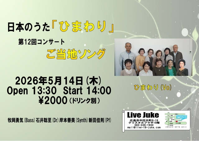 | 日本のうた「ひまわり」 第12回コンサート ご当地ソング ひまわりメンバー(Vo) 牧岡勇気(Bass)石井聡至(Dr)岸本善美(Synth)新田佳則(Pf)Open 13:30 Start 14:00 2000円(ドリンク別) | ||