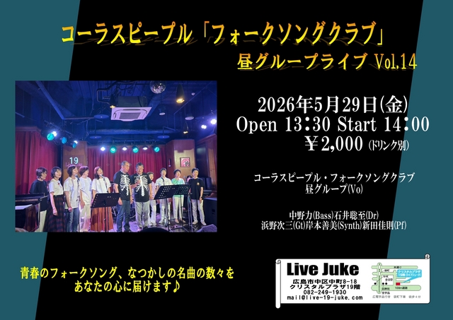 | コーラスピープル "フォークソングクラブ" 昼グループライブ vol.14 コーラスピープル・フォークソングクラブ 昼グループ(Vo) 中野力(Bass)石井聡至(Dr)浜野次三(Gt)岸本善美(Synth)新田佳則(Pf)Open 13:30 Start 14:00 2000円(ドリンク別) | ||