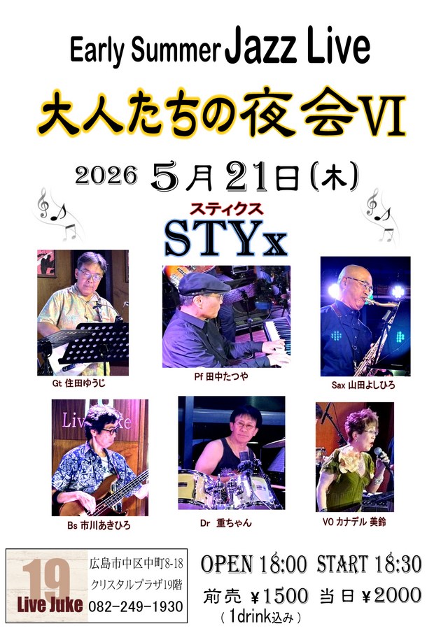| Jazz Live ~大人たちの夜会 Ⅵ~ STYx(スティクス):田中辰弥(Pf)山田芳敬(Sax) 住田雄二(Gt)カナデル美鈴(Vo)黌農重盛(Dr)市川明弘(Bass)Open 18:00 Start 18:30 前売1500円 当日2000円(1ドリンク付) | ||