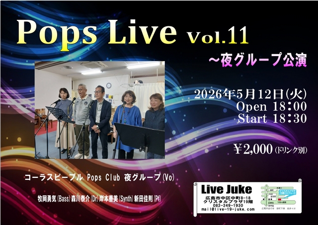 | Pops Live vol.11 コーラスピープルPopsクラブ 夜グループ(Vo) 牧岡勇気(Bass)森川泰介(Dr)岸本善美(Synth)新田佳則(Pf)Open 18:00 Start 18:30 2000円(ドリンク別) | ||