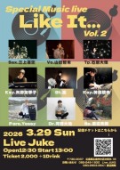 | Like it... vol.2 山田智未(Vo)三上凜空(Sax)石原大輝(Tp)凛(Gt)矢野友季子(Syn) 神田稜央(Pf)渡辺美陽(Bass)Yossy(Perc)河野大地(Dr.)Open 12:30 Start 13:00 前売2000円 当日2500円(ドリンク別) 配信1000円 予約受付先:080-2903-5641 | ||