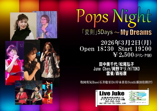 | ポップスナイト「変則」5Days ~ My Dreams 田中美千代/松尾弘子/June Chen 岡野マリ/雲雀/HITOKO/森裕康 牧岡勇気(Bass)石井聡至(Dr)岸本善美(Synth)新田佳則(Pf)Open 18:30 Start 19:00 2500円(ドリンク別) | ||