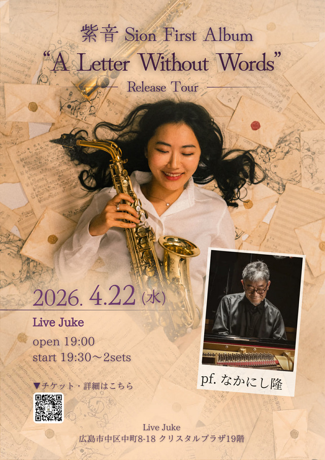 | 紫音 Sion First Album "A Letter Without Words"Release Tour 紫音Sion(Sax)なかにし隆(Pf)Open 19:00 Start 19:30 前売3500円 学生2500円(当日\500UP/ドリンク別) ▼チケットはこちらから:https://livepocket.jp/e/sion2026-hiroshima | ||