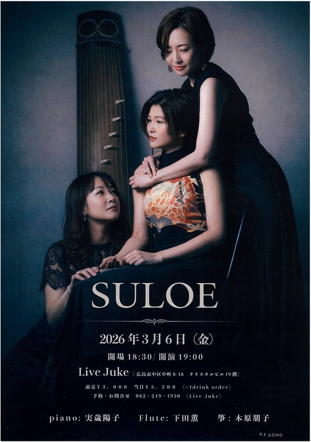 | SULOE 実歳陽子(Pf)下田薫(Fl)木原朋子(箏)Open 18:30 Start 19:00 前売3000円 当日3500円(ドリンク別) ご予約はこちら♪→Live Juke:mail@live-19-juke.com | ||
