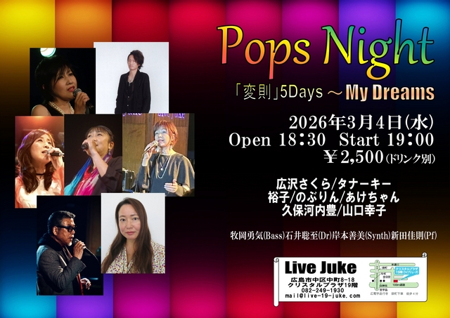 | ポップスナイト「変則」5Days ~ My Dreams 広沢さくら/タナーキー/裕子/のぶりん あけちゃん/久保河内豊/山口幸子 牧岡勇気(Bass)石井聡至(Dr)岸本善美(Synth)新田佳則(Pf)Open 18:30 Start 19:00 2500円(ドリンク別) | ||